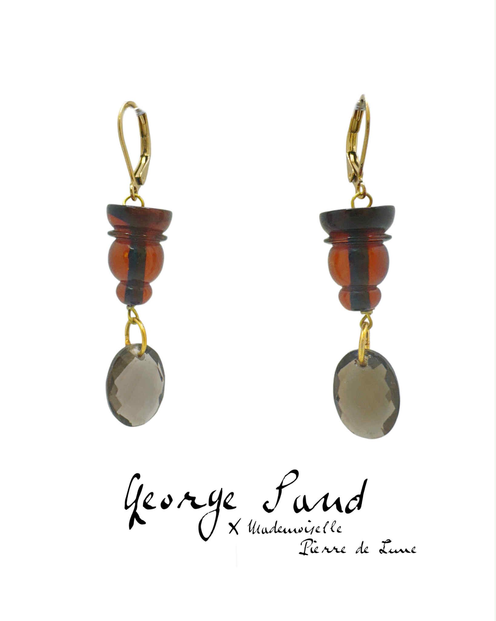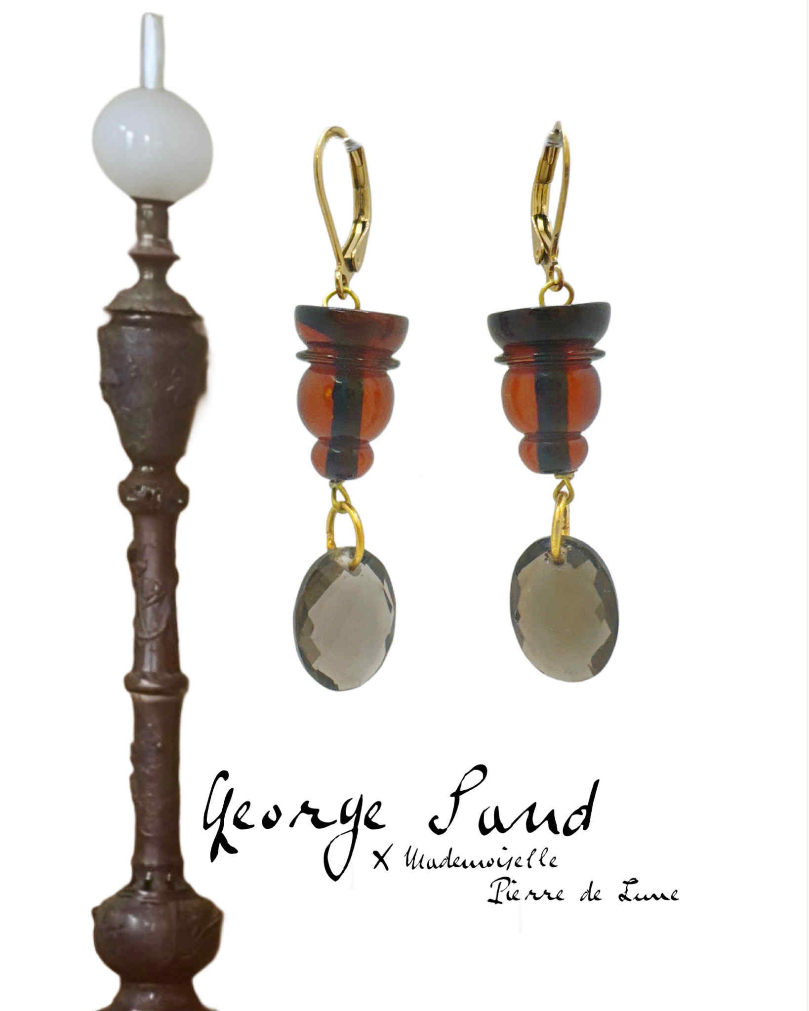Au domaine de George Sand, une lampe à pétrole se dresse comme témoin des veillées romantiques. Son pied sculpté, aux courbes généreuses, trouve un écho inattendu dans la création de ces boucles d’oreilles. L’ambre, travaillé en volumes presque identiques, dialogue avec le métal ancien, tandis que le quartz fumé facetté capture la lumière comme une flamme fragile sous le verre. Inspirée par l’objet du quotidien devenu mémoire, cette parure relie le geste des artisans d’hier et la créativité contemporaine, dans un hommage vibrant à l’élégance intemporelle de Nohant.